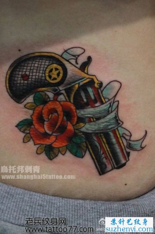 欧美风格的手枪玫瑰花纹身_玫瑰花纹身图案大全_纹身图吧