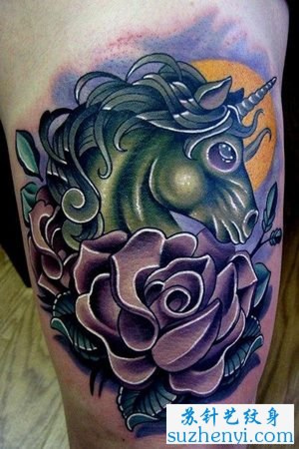 彩色独角兽玫瑰花纹身_玫瑰花纹身图案大全_纹身图吧