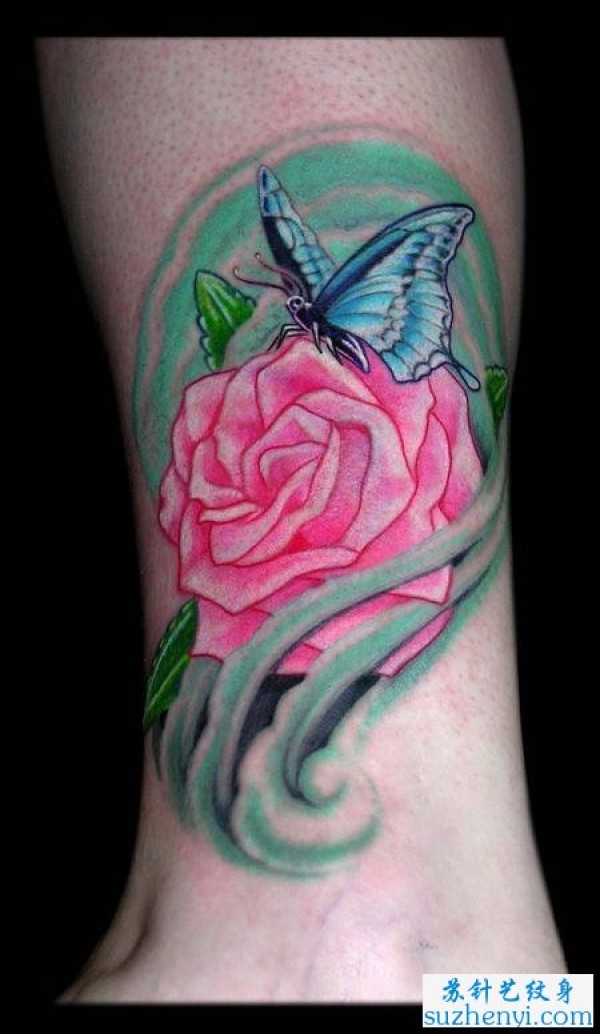脚踝玫瑰蝴蝶纹身_玫瑰花纹身图案大全_纹身图吧