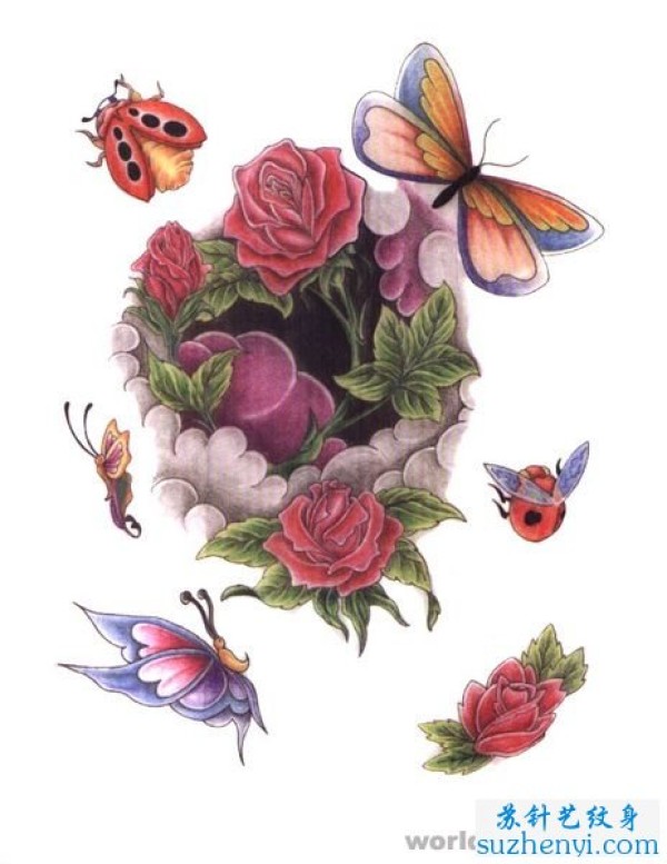 绚丽的玫瑰蝴蝶瓢虫纹身_玫瑰花纹身图案大全_纹身图吧