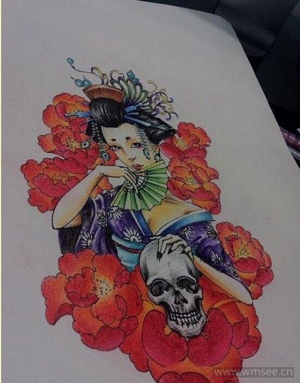 艺妓骷髅玫瑰花纹身图案_玫瑰花纹身图案大全_纹身图吧