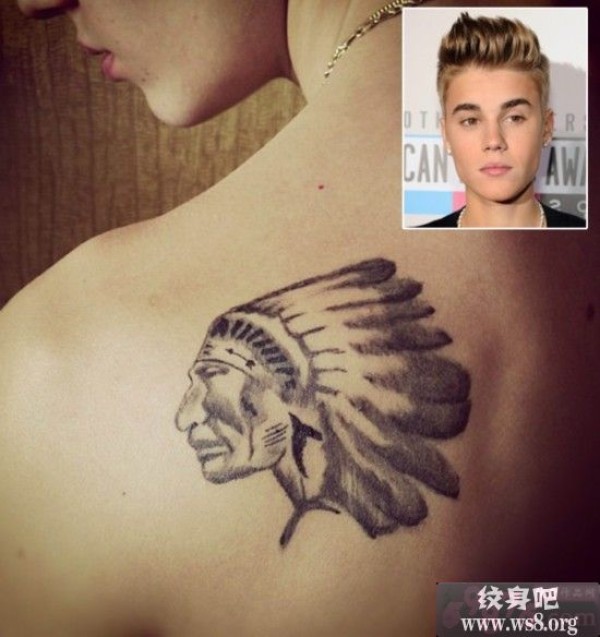比伯背上印第安人头像刺青图案_明星纹身图案大全_纹身图吧