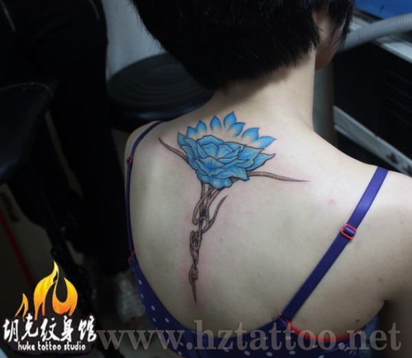 性感美女背部迷人蓝色莲花纹身图片_女生纹身图案大全_纹身图吧