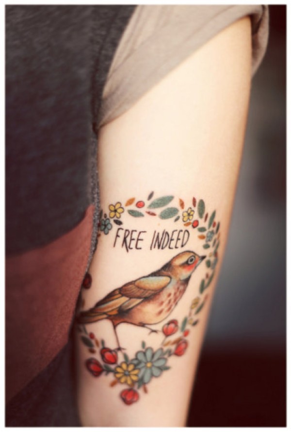 女生手臂小鸟小花彩色纹身图片_女生纹身图案大全_纹身图吧