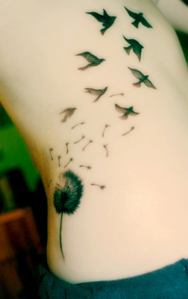 女生腰部蒲公英小鸟飞翔唯美纹身_女生纹身图案大全_纹身图吧