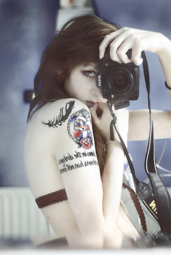 女生手臂肖像羽毛纹身图案图片_女生纹身图案大全_纹身图吧