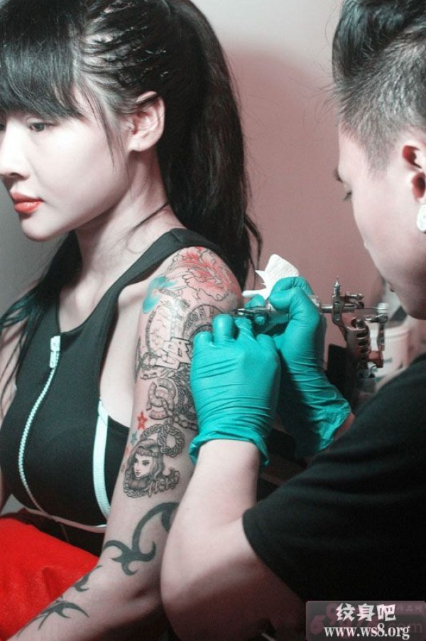 美女个性花臂刺青现场图案_女生纹身图案大全_纹身图吧