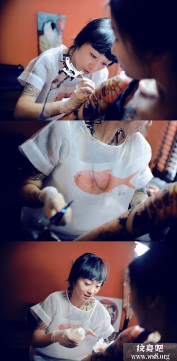 美女刺青师肩部刺青创作过程图案_女生纹身图案大全_纹身图吧