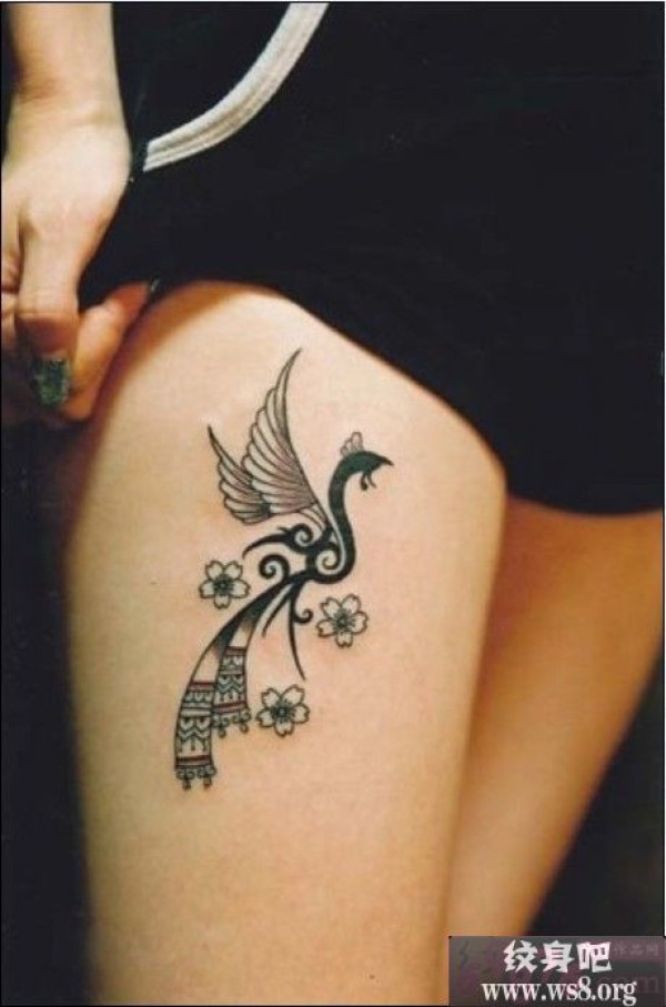 女生大腿骄傲的孔雀纹身图案_女生纹身图案大全_纹身图吧