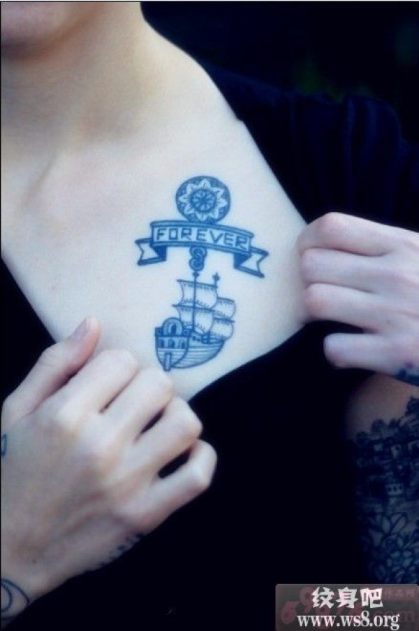 女生胸前蓝色帆船个性纹身图案_女生纹身图案大全_纹身图吧