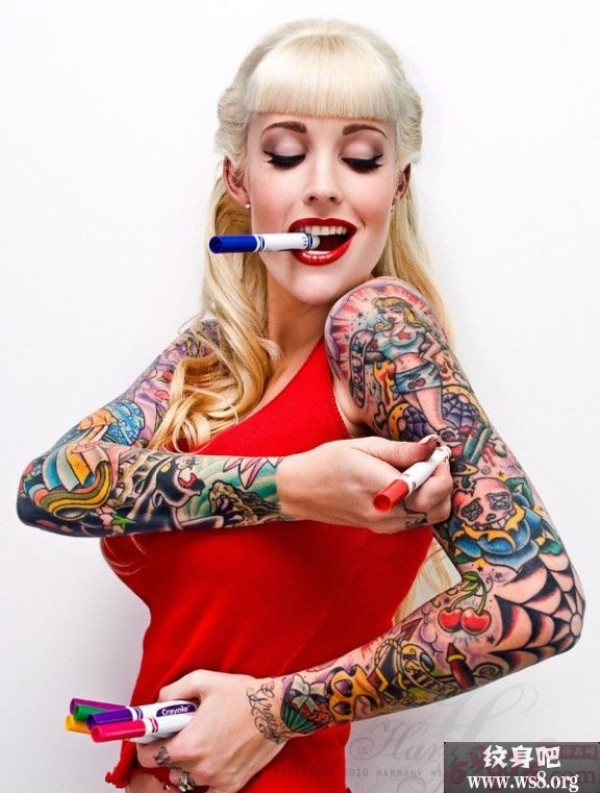 红唇美女个性花臂刺青图案_女生纹身图案大全_纹身图吧