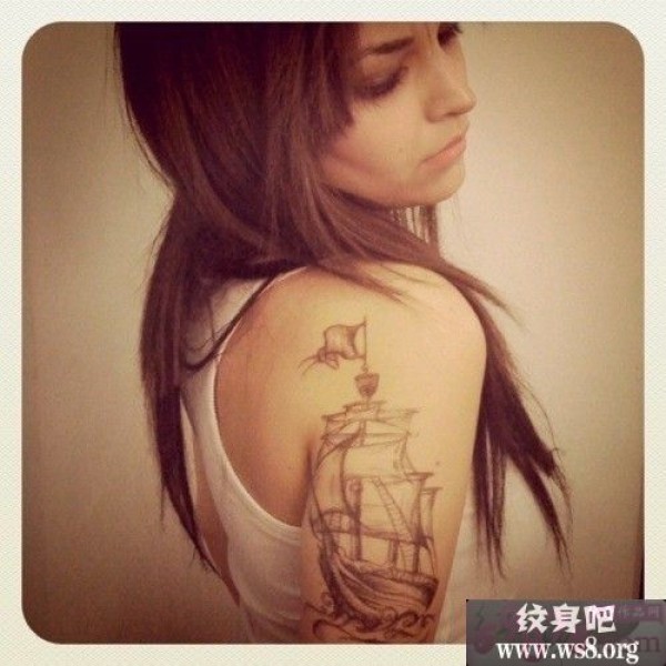欧美女生手臂个性帆船图刺青图案_女生纹身图案大全_纹身图吧