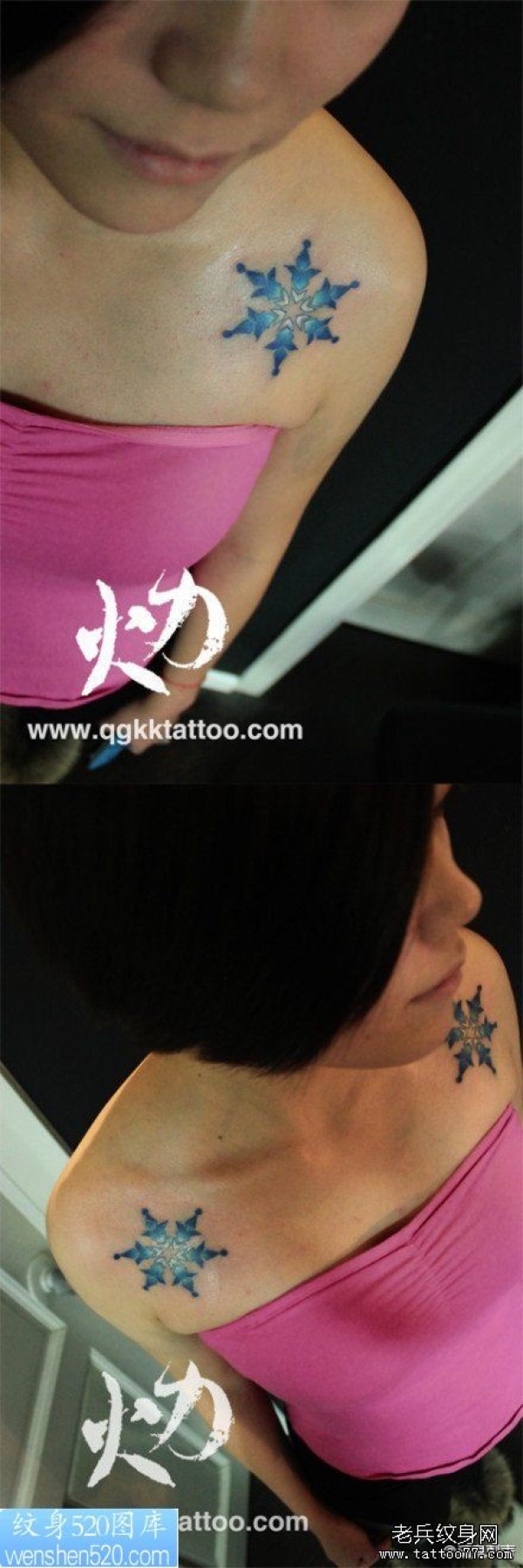 女生肩膀处漂亮的彩色雪花纹身图案_女生纹身图案大全_纹身图吧