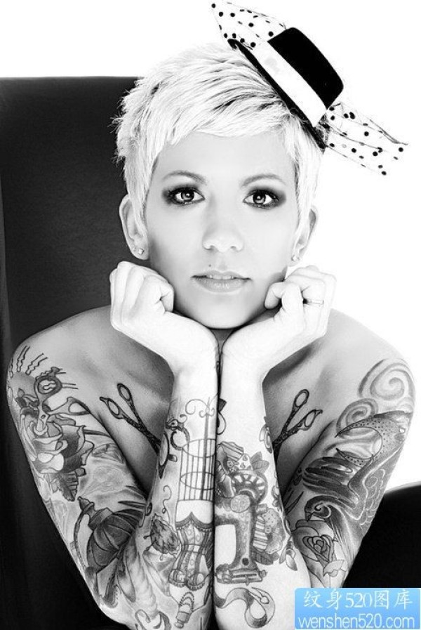 个性黑白女性花臂纹身图案_女生纹身图案大全_纹身图吧