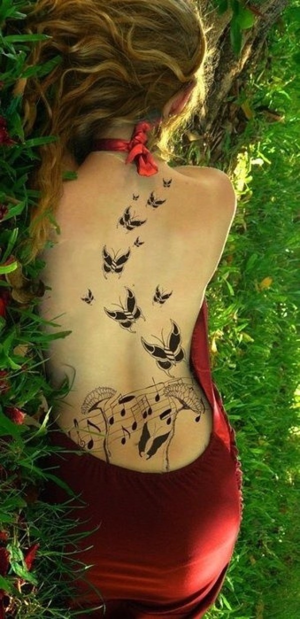女性背部音符和花朵纹身_女生纹身图案大全_纹身图吧