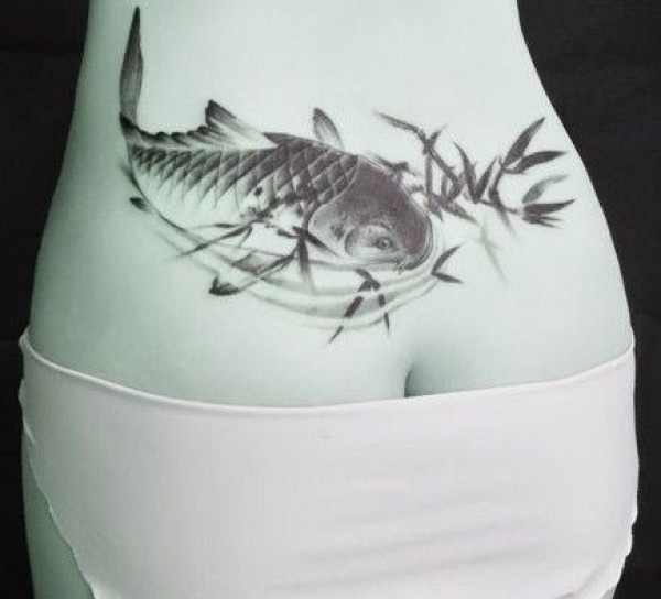 女性臀部的水墨鱼纹身_女生纹身图案大全_纹身图吧