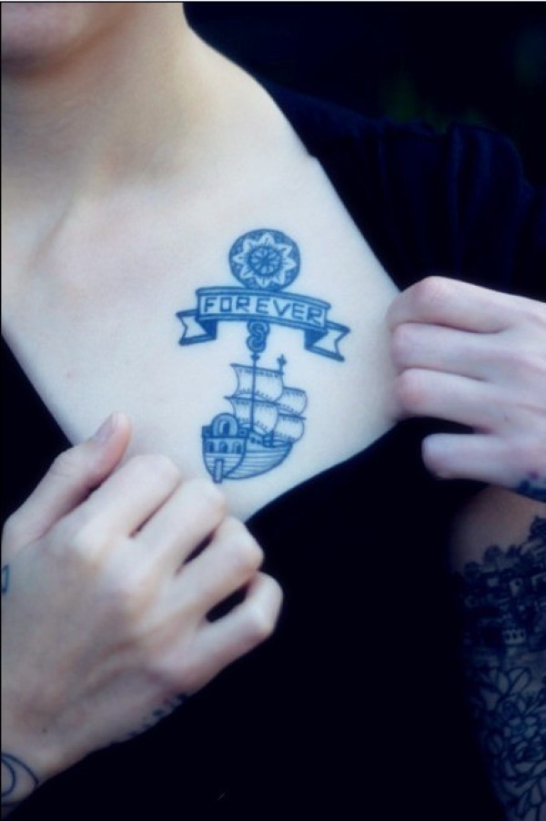 女性胸前蓝色帆船FOREVER欧美刺青_女生纹身图案大全_纹身图吧