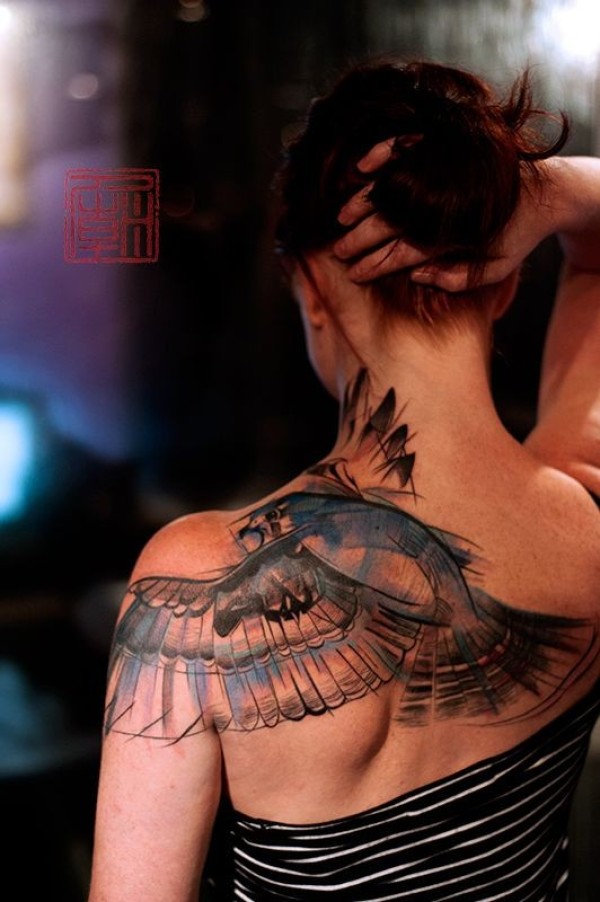 女性背部一只飞翔的大鸟纹身图案_女生纹身图案大全_纹身图吧