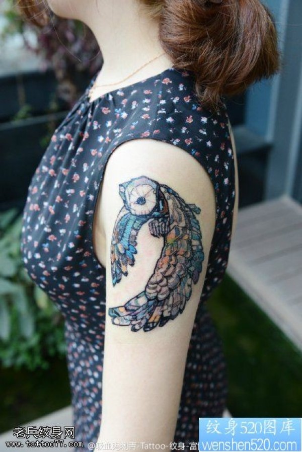 女性手臂彩色猫头鹰纹身图案_女生纹身图案大全_纹身图吧