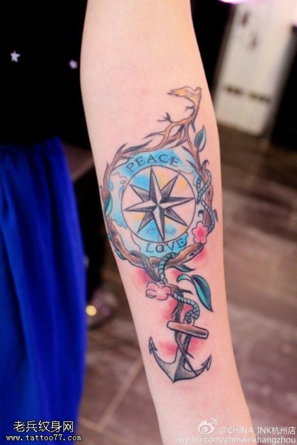 女性手臂彩色指南针船锚纹身图案_女生纹身图案大全_纹身图吧