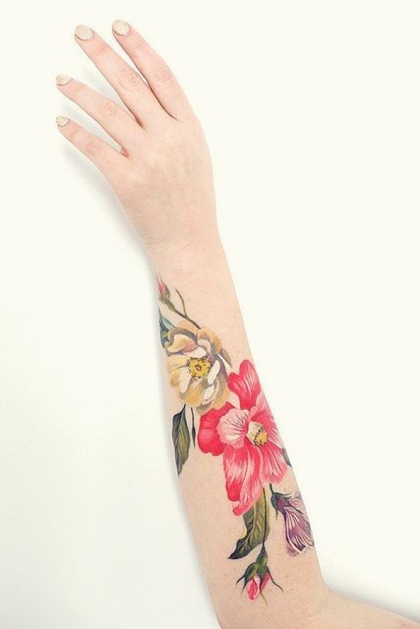 女性手臂上花朵和小鸟纹身_女生纹身图案大全_纹身图吧
