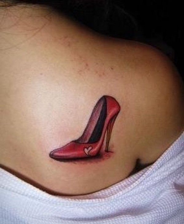女生侧背上奇特的高跟鞋图案纹身第一次看到这_女生纹身图案大全_纹身图吧