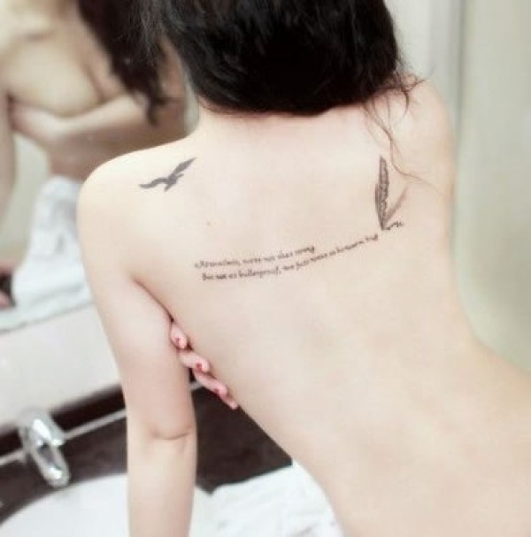 美女香艳侧背上的飞鸟纹身图案飞鸟加鸡毛笔与_女生纹身图案大全_纹身图吧