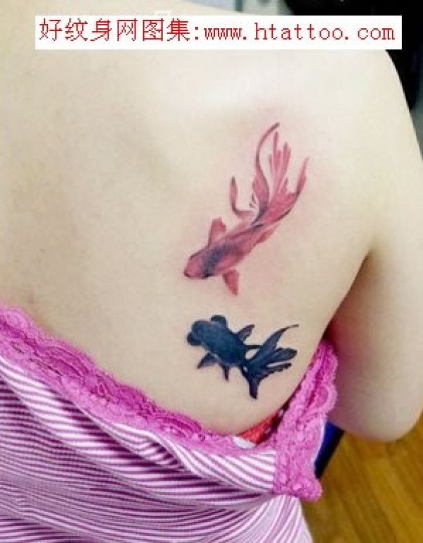 美女侧背上各种小金鱼纹身图案一对游动姿态的_女生纹身图案大全_纹身图吧