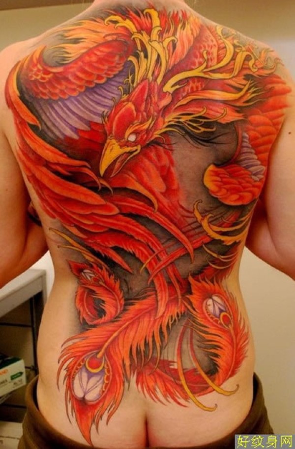 女生后背彩色主题的烈鸟纹身图非常完美与灵气_女生纹身图案大全_纹身图吧