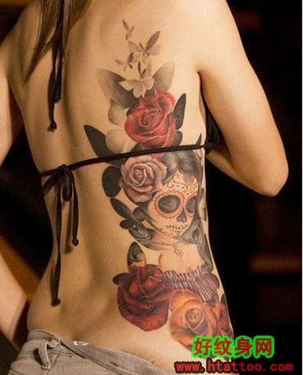 女生侧背鲜花与恐怖面具纹身_女生纹身图案大全_纹身图吧