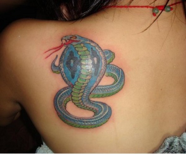 女生侧背彩绘毒蛇纹身_女生纹身图案大全_纹身图吧