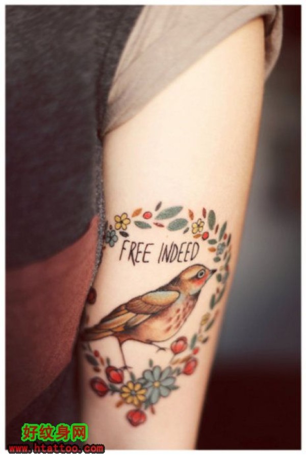女生手臂小鸟小花彩色纹身_女生纹身图案大全_纹身图吧