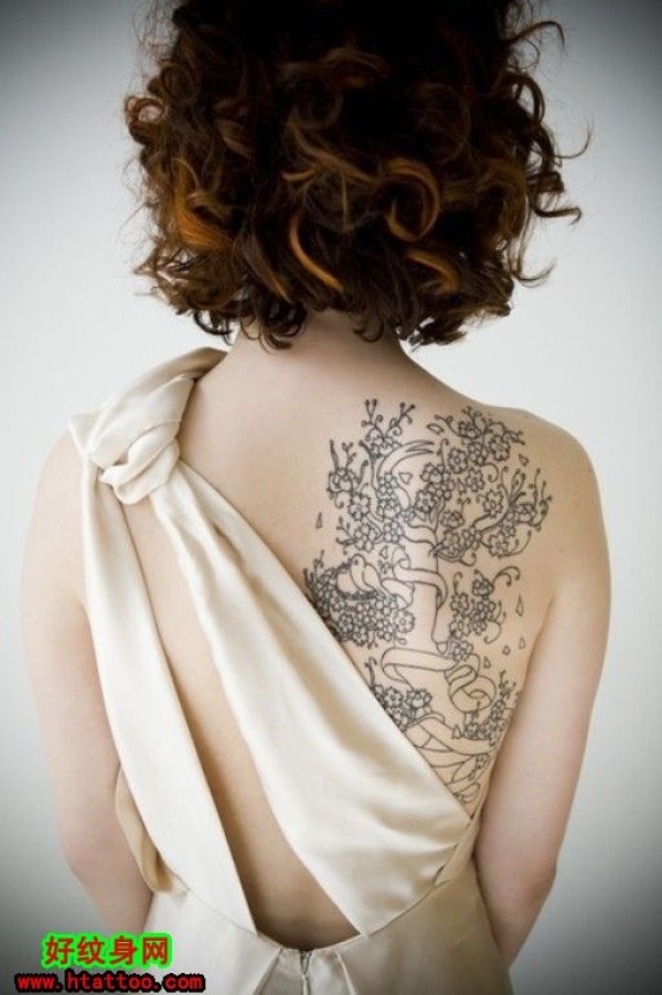 女生性感背部桃花树唯美纹身_女生纹身图案大全_纹身图吧