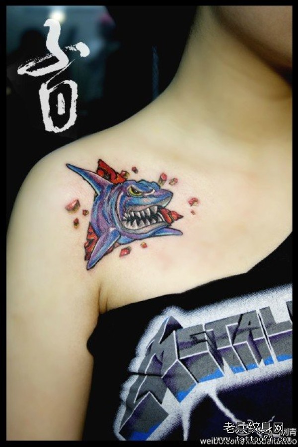 女生肩膀处经典很酷的鲨鱼纹身图案_女生纹身图案大全_纹身图吧
