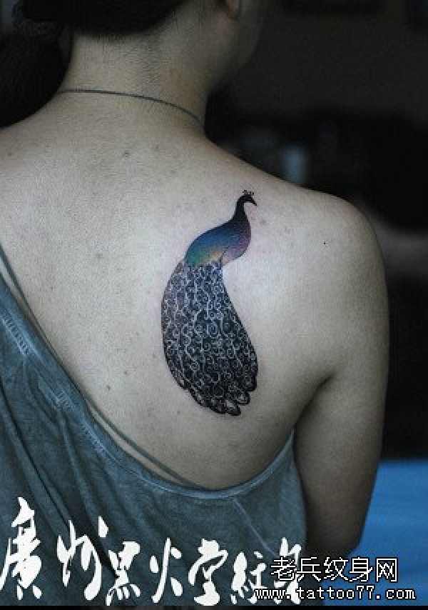 女生肩背潮流时尚的孔雀纹身图案_女生纹身图案大全_纹身图吧