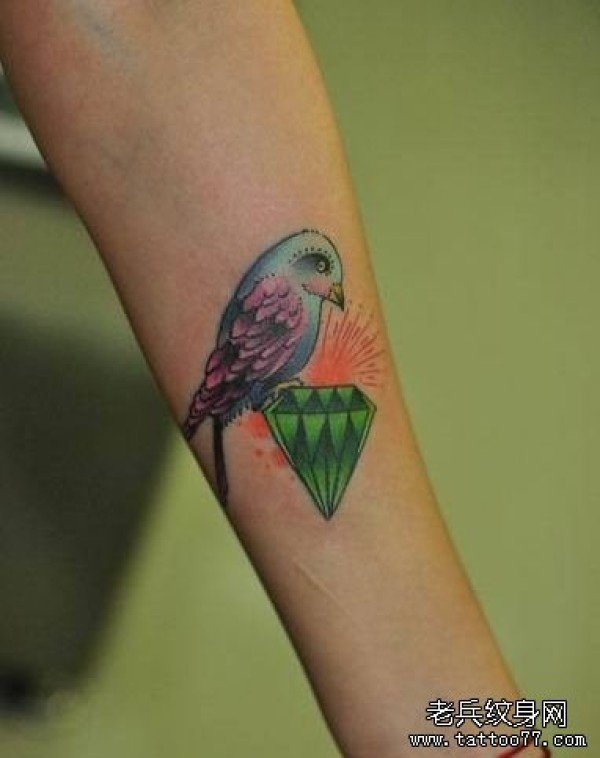 女生手臂一款彩色小鸟与钻石纹身图案_女生纹身图案大全_纹身图吧