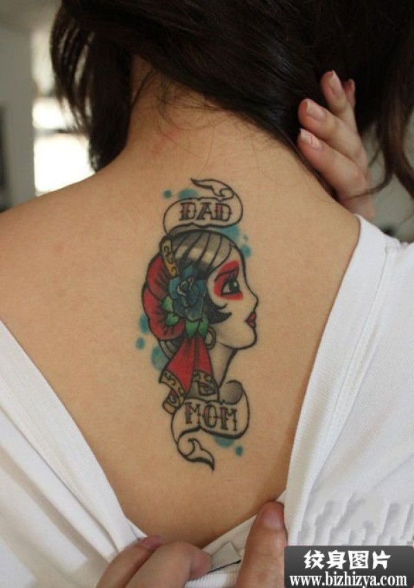 彩色美女头像颈部纹身图案图片_女生纹身图案大全_纹身图吧