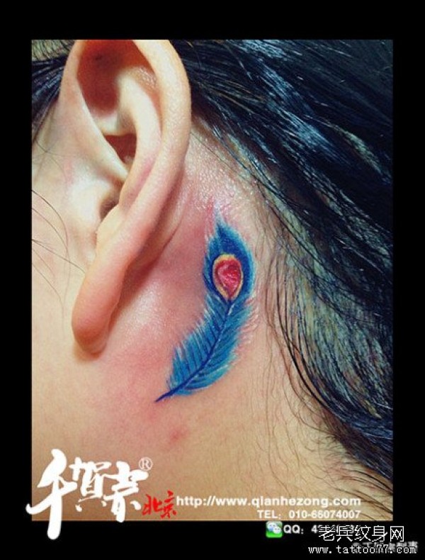 女生耳部小巧的一款彩色羽毛纹身图案_女生纹身图案大全_纹身图吧