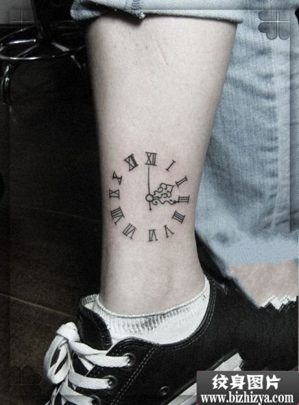 女生小腿创意时钟刺青图案图片_女生纹身图案大全_纹身图吧