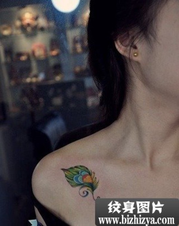 女生肩部彩色羽毛纹身图案图片_女生纹身图案大全_纹身图吧