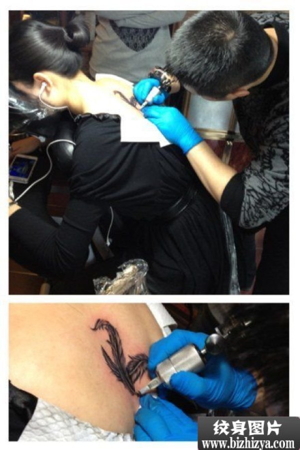 女生后背时尚羽毛纹身现场图案图片_女生纹身图案大全_纹身图吧