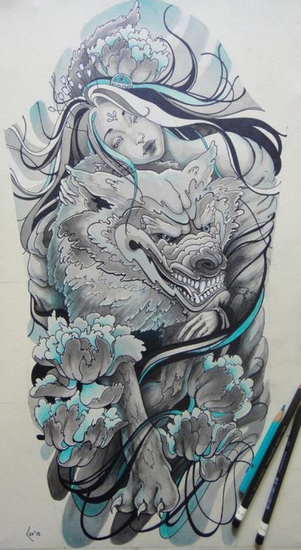 漂亮的美女与狼纹身图案_女生纹身图案大全_纹身图吧
