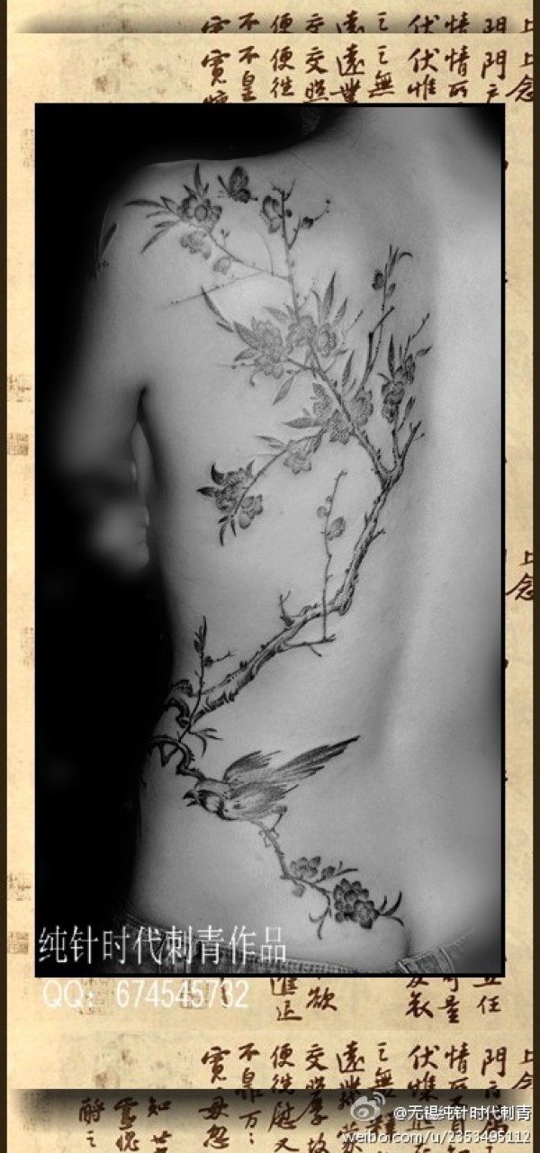 女生后背精美的桃花啼鸟图纹身图案_女生纹身图案大全_纹身图吧
