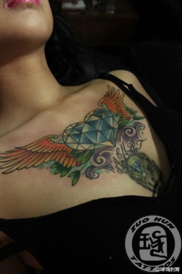 女生胸前精美的爱心钻石纹身图案_女生纹身图案大全_纹身图吧