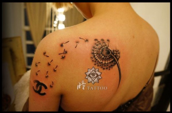 女生后背唯美时尚的黑灰蒲公英是图案_女生纹身图案大全_纹身图吧