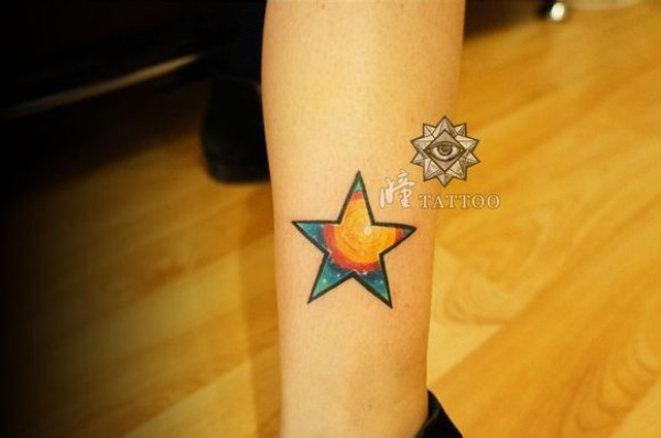 女生腿部一款好看的彩色星空五角星纹身图案_女生纹身图案大全_纹身图吧