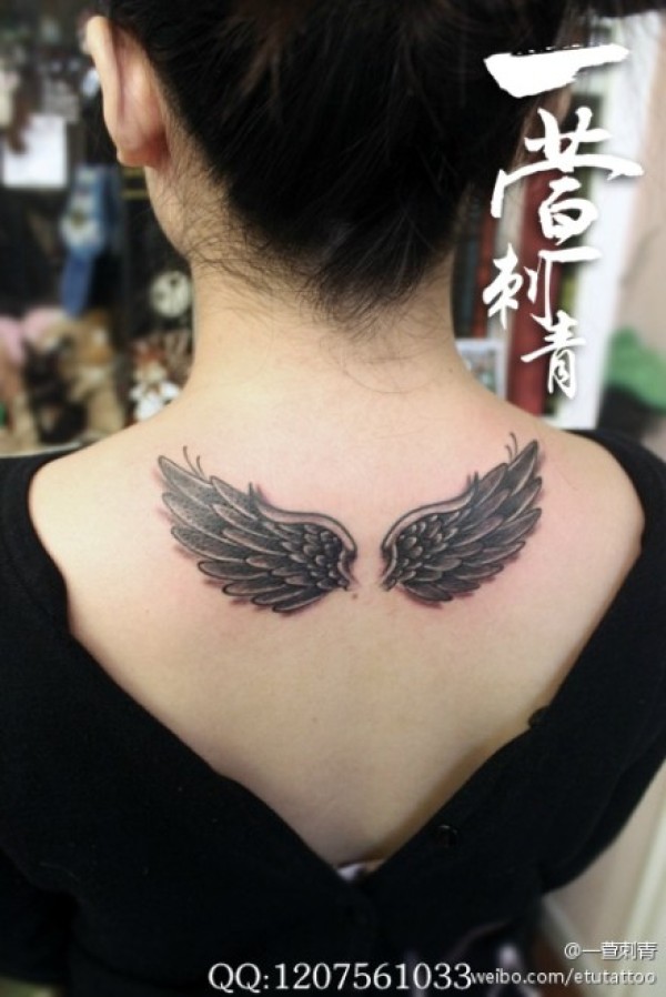 女生后背一款黑灰翅膀纹身图案_女生纹身图案大全_纹身图吧