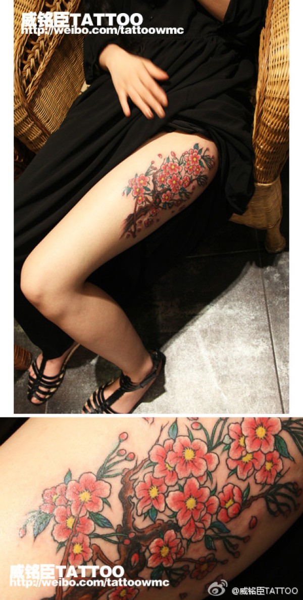 女生腿部潮流时尚的桃花纹身图案_女生纹身图案大全_纹身图吧