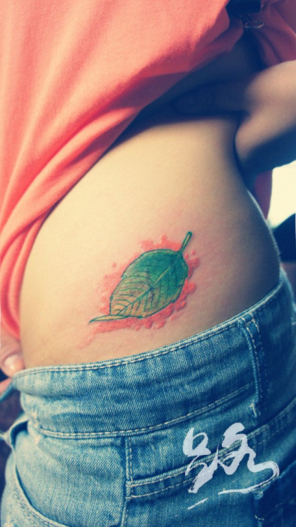 女生腰部一款小巧的彩色树叶纹身图案_女生纹身图案大全_纹身图吧