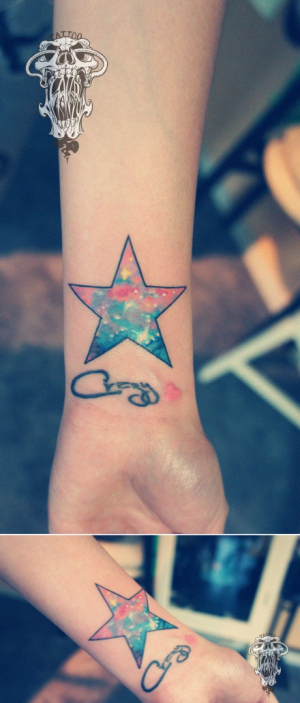 女生手腕小巧精美的彩色星空五角星纹身图案_女生纹身图案大全_纹身图吧